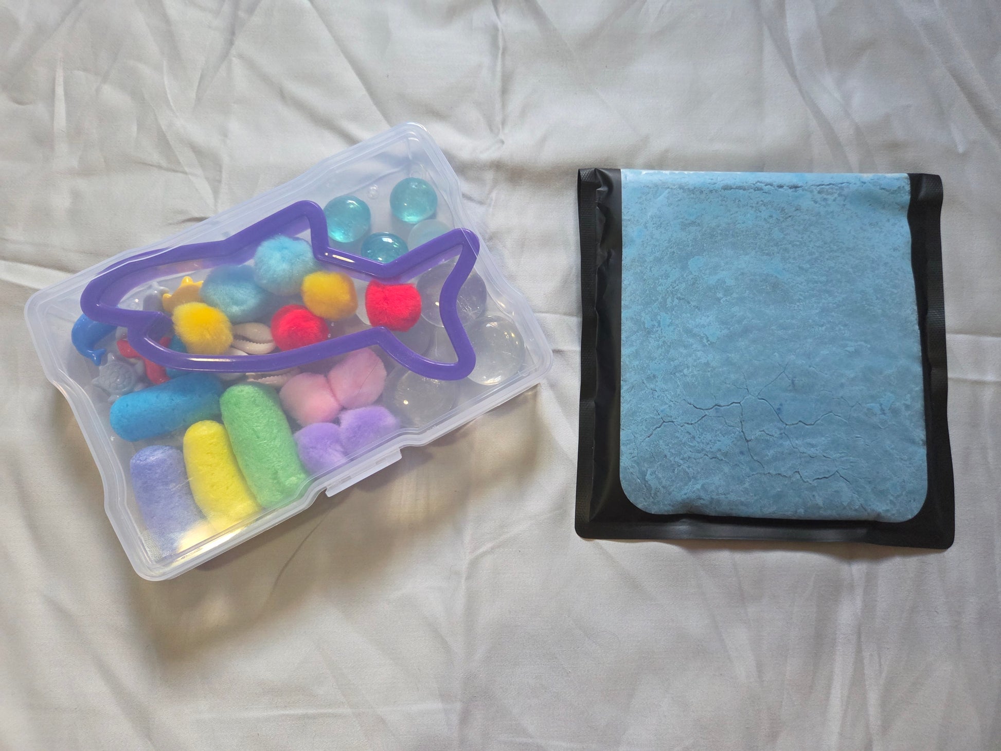 Our boxes include 1 cup of sensory sand, a cookie cutter, beads, pom-poms, and other fillers used for exploring different textures and types of play!