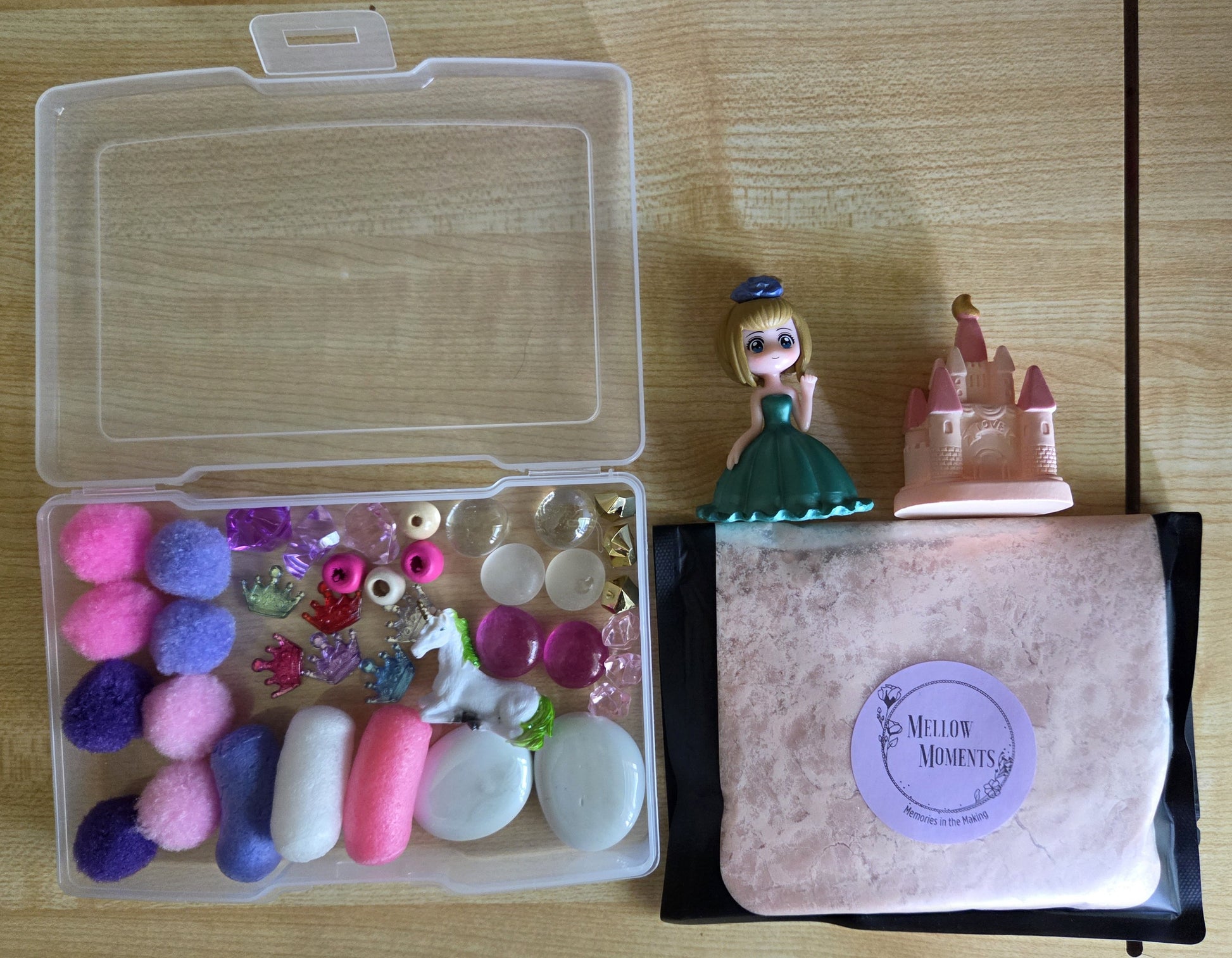 Our boxes include 1 cup of sensory sand, 1 princess, castle, unicorn, gems, pom-poms, and other filler items for exploring different textures and types of play!